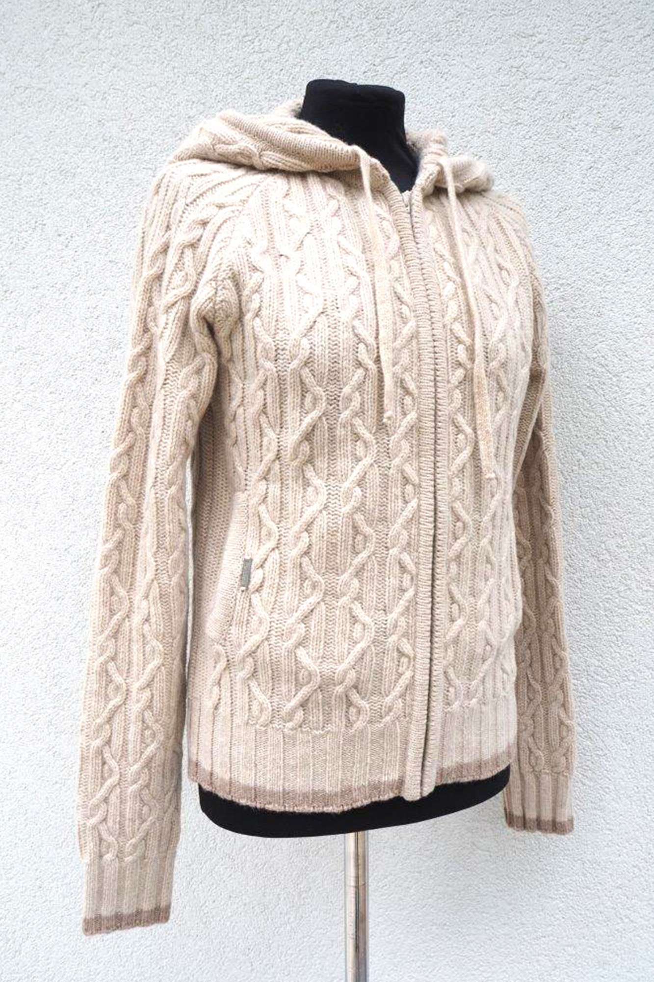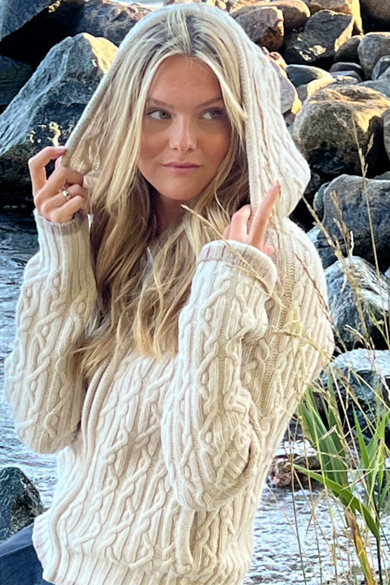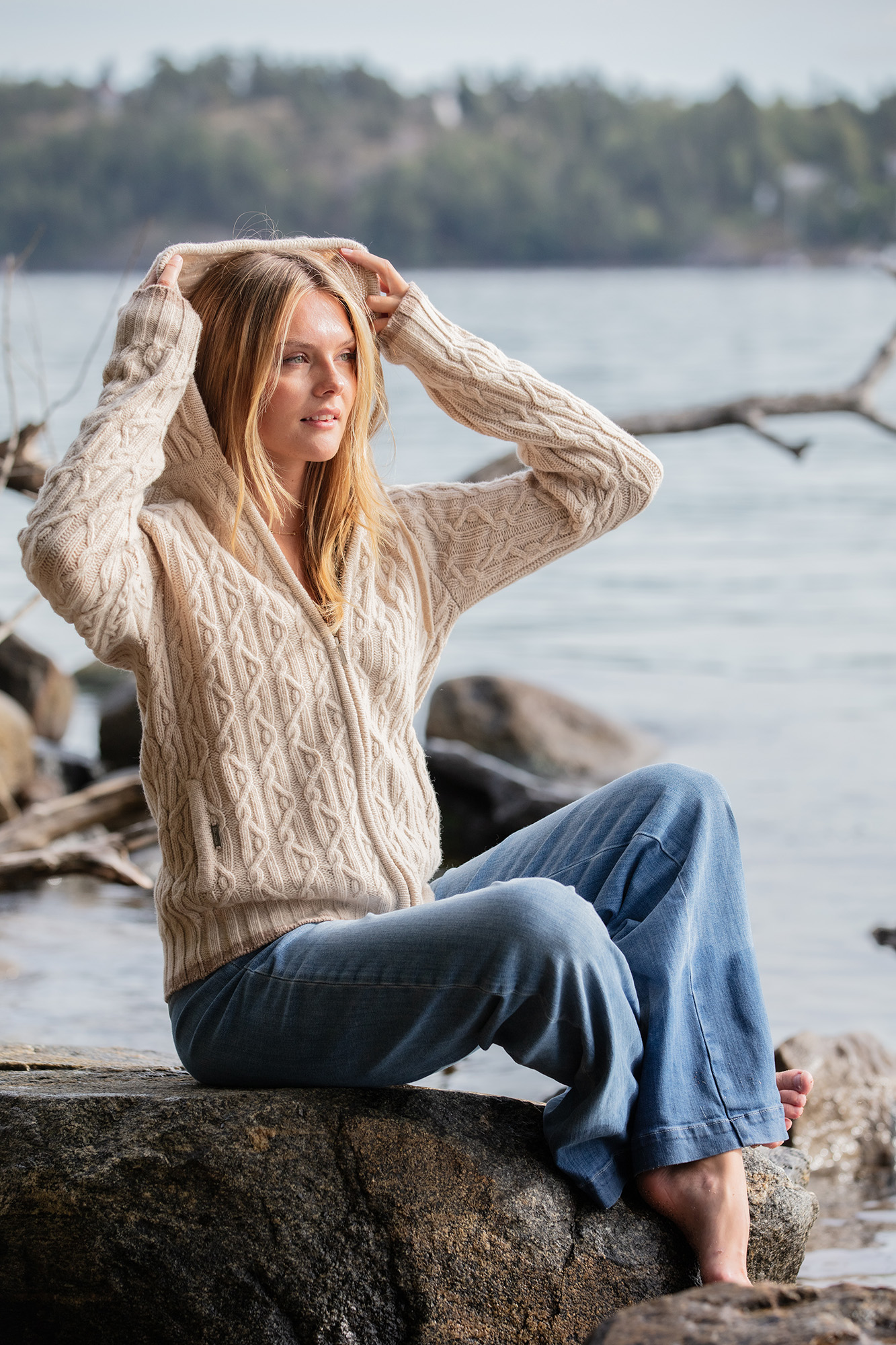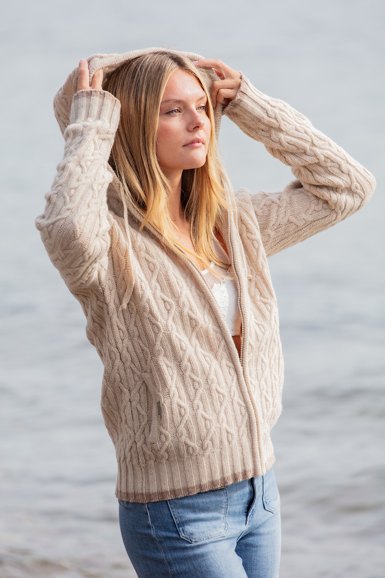 En elegant cardigan med huva och dragkedja. Tröjan är i en stilfull beige ton med en accentfärg i taupe/mörkare beige med ett avancerat kabelstickat mönster. Breda ribbstickade muddar på ärmar och nertill.