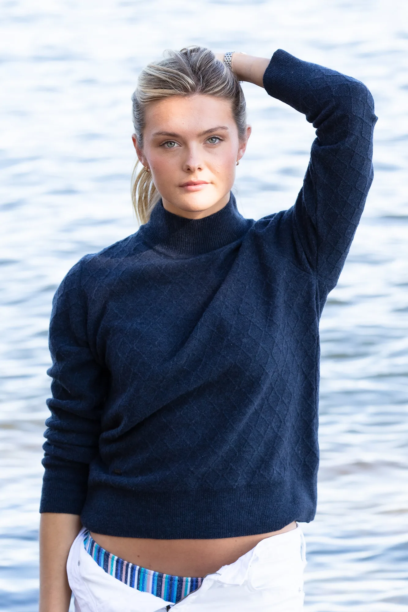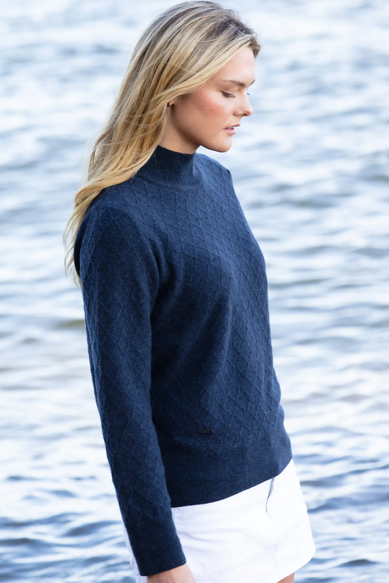 Höghalsad tunn, mjuk och varm tröja i lammull med ett vackert diamantformat jaquardmönster .