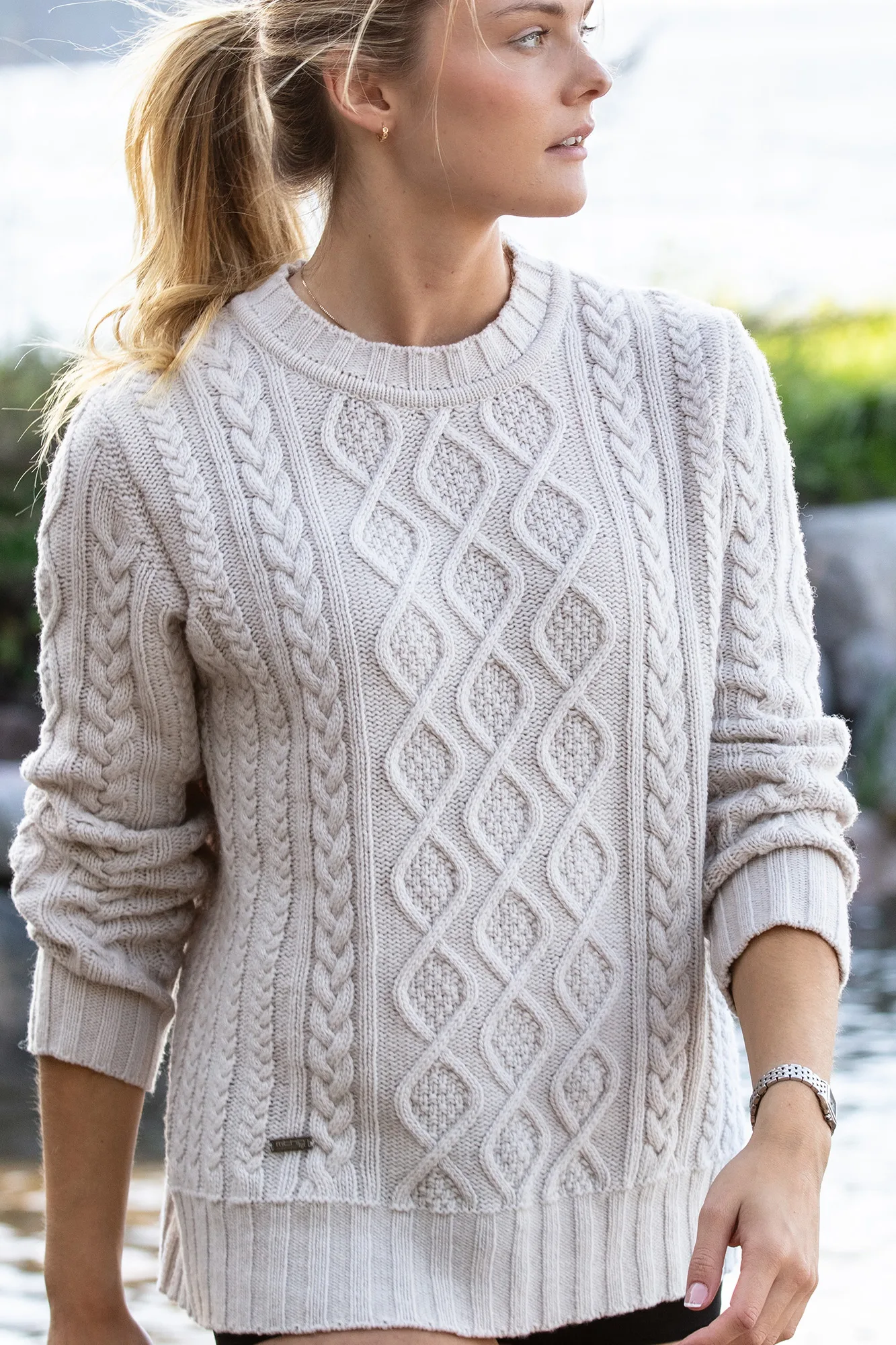 En varm och mjuk tröja i finaste Merinoull med rund halsringning. Stickmönstret på en hel tröja är en kombination av traditionella mönster och flätor.